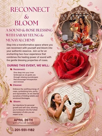 Join Sarah Yeung & MunayAlchemy for an enchanting two-hour experience that combines the healing power of sound with the gentle blessing properties of roses.